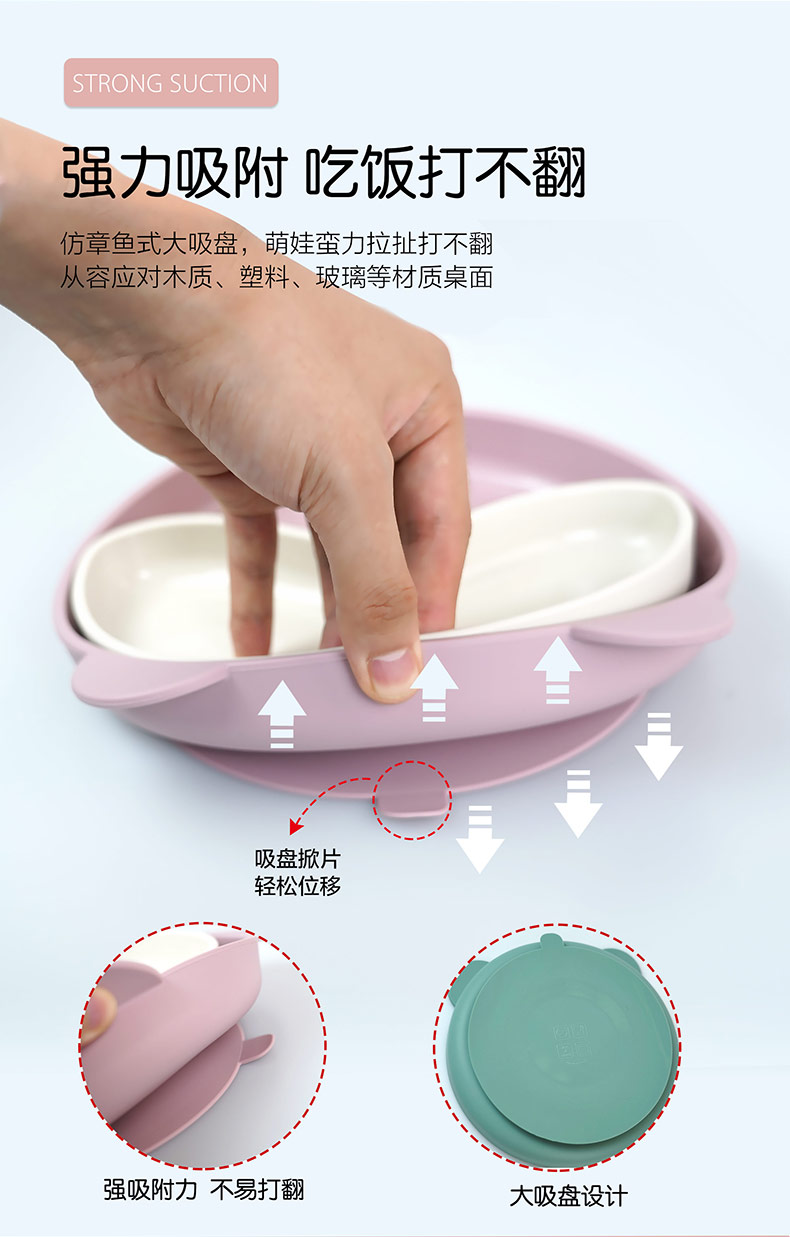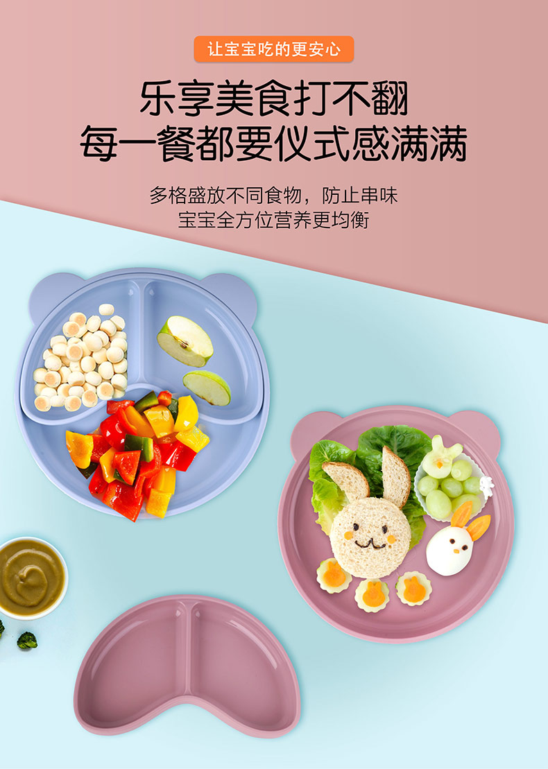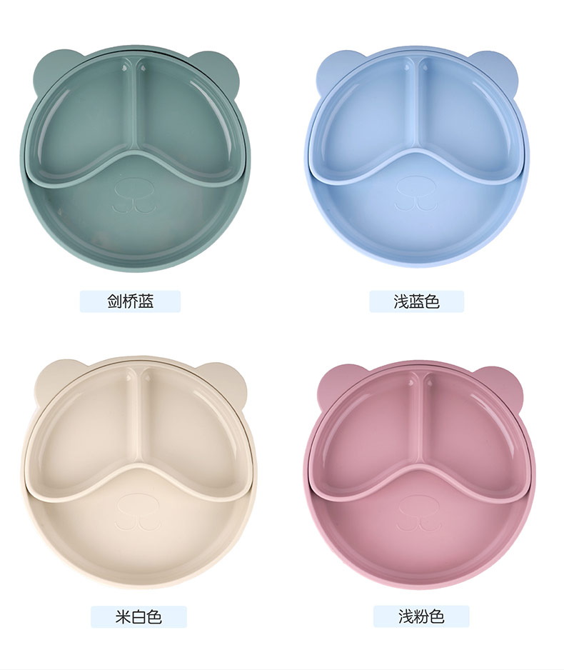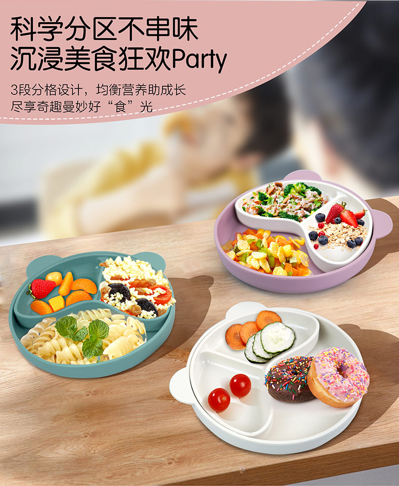 寶寶熱銷(xiāo)餐盤(pán)可拆分食品級(jí)硅膠分隔盤(pán)輔食吸盤(pán)三格兒童硅膠餐盤(pán)