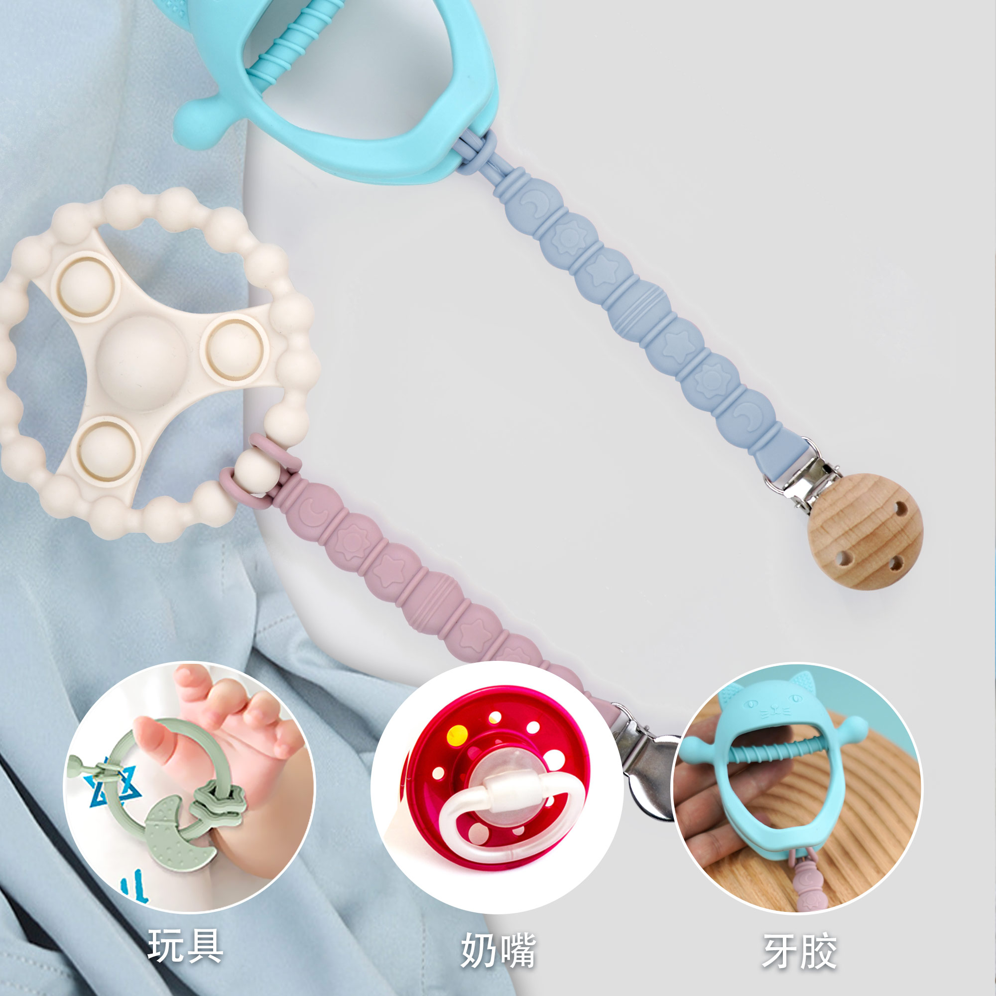 防掉鏈硅膠奶嘴鏈 嬰兒食品級(jí)可水煮防掉鏈牙膠
