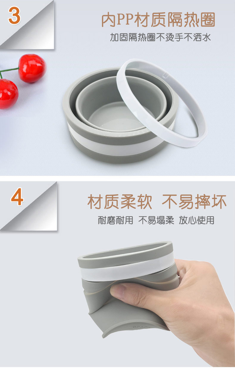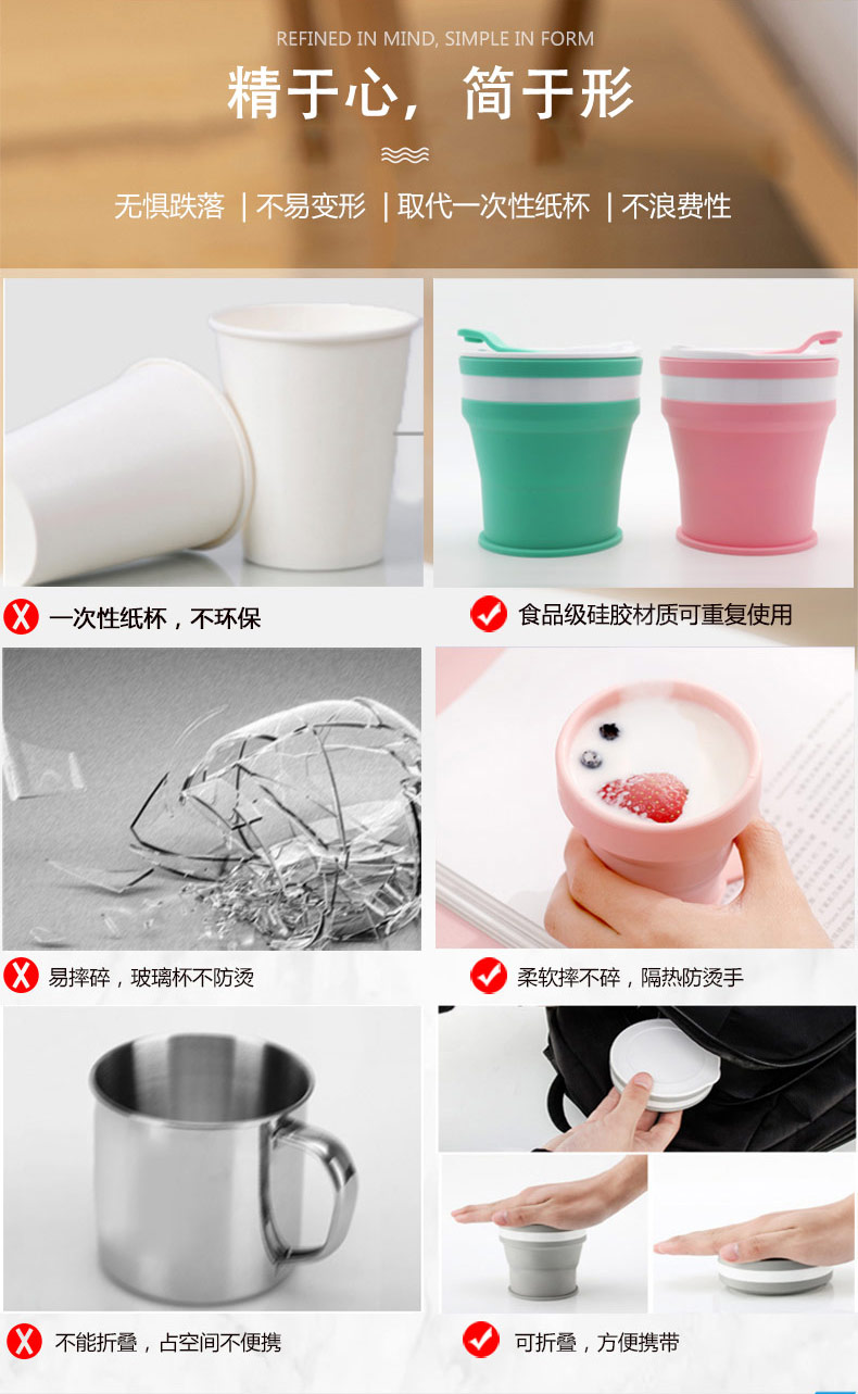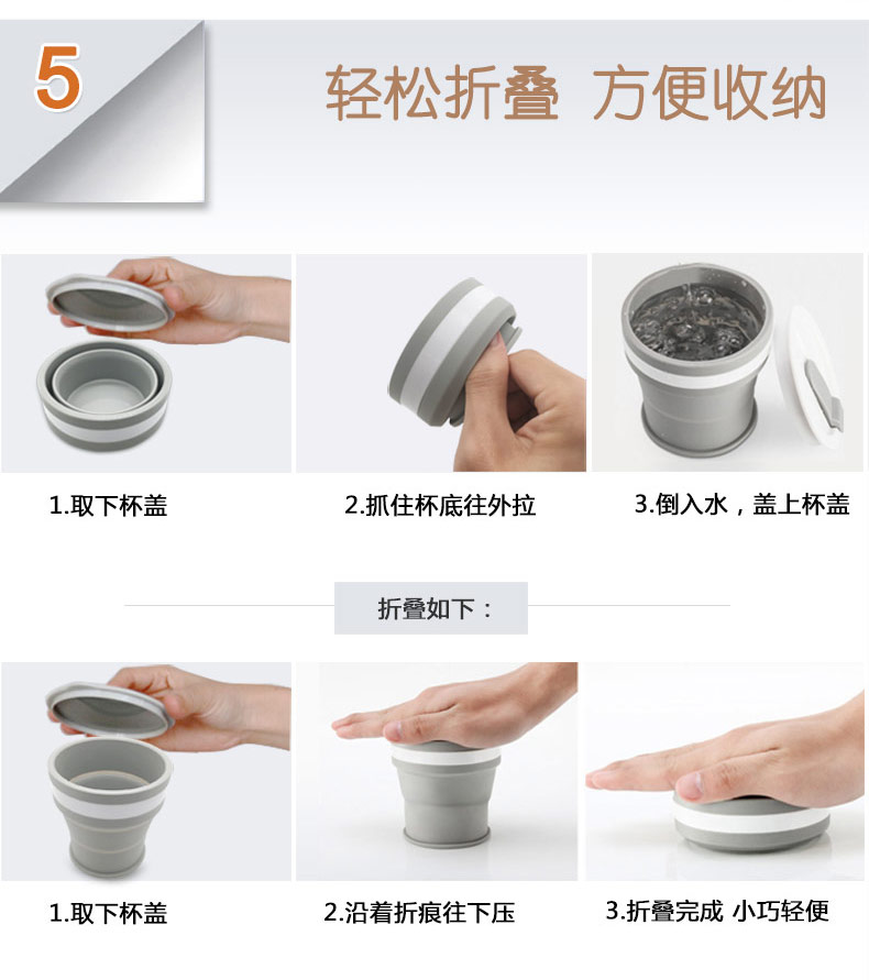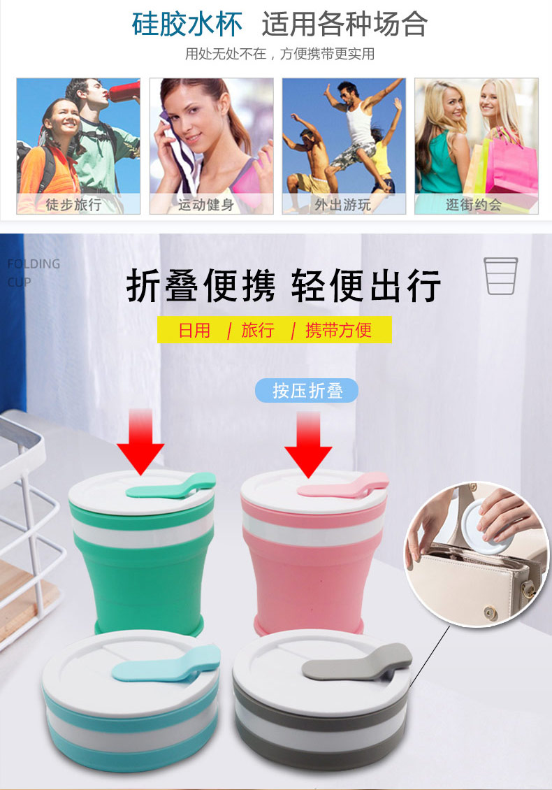 折疊式硅膠水杯成為運(yùn)動以及郊游的便攜物品之一,水喝完后直接折疊放入口袋減小儲物空間替代了對水壺和瓶裝礦泉水的不足, 完全顛覆了消費(fèi)者對硅膠折疊水杯的看法,硅膠折疊杯是一種攜帶方便、使用衛(wèi)生、具有雙層杯壁的折疊杯。外壁的兩個相鄰段通過螺紋連接,內(nèi)壁的兩個相鄰段為錐形配合,可上下移動。通過外壁螺紋旋轉(zhuǎn)驅(qū)動內(nèi)壁上下展開,實現(xiàn)杯形折疊和拉伸動能。